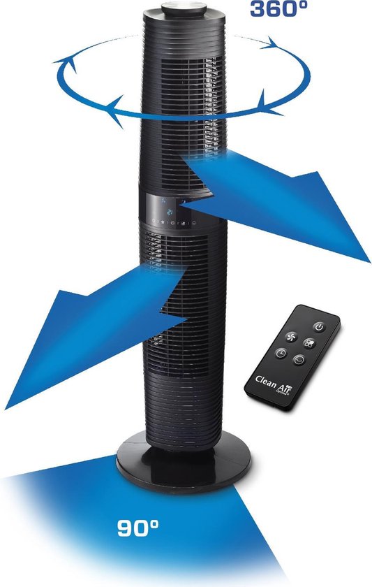 De 90º en 360º oscillatiemogelijkheden van de ventilator zorgen ervoor dat koele lucht gelijkmatig door de kamer circuleert, en de temperatuursensor zorgt ervoor dat de ventilator alleen werkt wanneer dat nodig is. Dit maakt de Clean Air Optima® CA-406B een van de meest energiezuinige torenventilatoren op de markt.