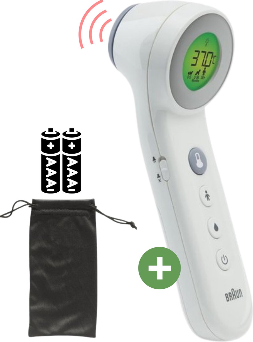 De Braun No Touch + Touch-thermometer is het perfecte instrument om de temperatuur van het voorhoofd, een voorwerp of vloeistof te meten. Met Braun's unieke "Age precision" technologie, kunt u er zeker van zijn dat u elke keer nauwkeurige metingen krijgt. De No Touch + Touch Thermometer is ook zeer geschikt voor de voedings- en vloeistoffenstand.